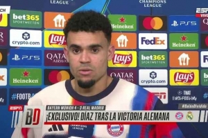 体育资讯4月16日讯 欧冠1/4决赛次回合比赛,路易斯·迪亚斯破门,拜仁主场4-3击败皇马,总比分6-4晋级四强,赛后迪亚斯接受了媒体的采访。