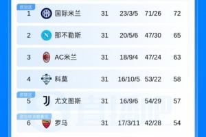 意甲积分榜:米兰近3轮仅1胜降第3,那不勒斯反超升第2距国米7分